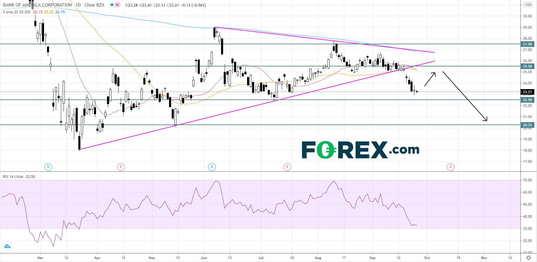 嘉盛集团:金融机构美国银行(BAC)跌破了对称三角形图案的下行空间。对称三角形被...