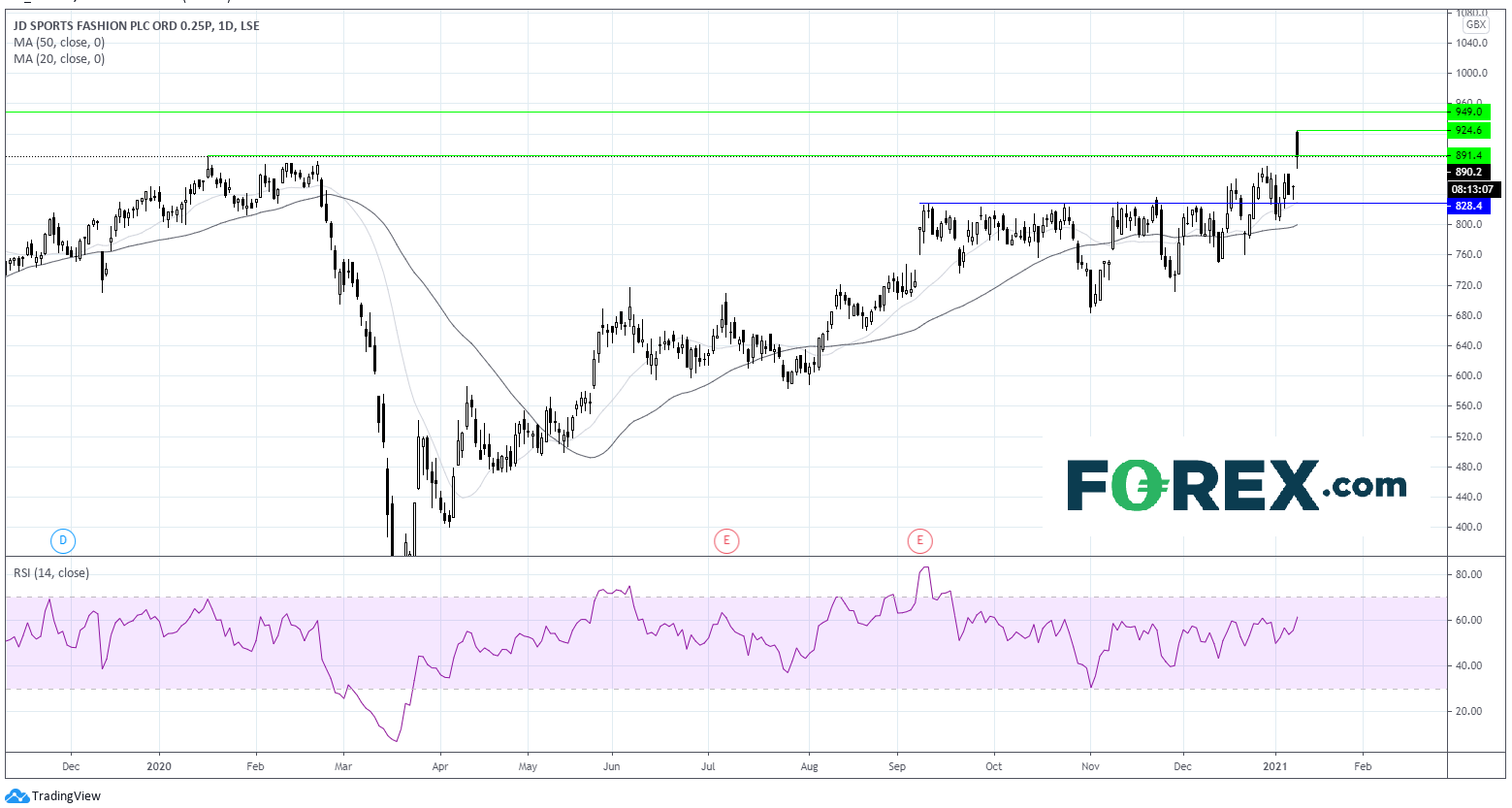 JD Sports股价开盘飙升至历史新高923,随后小幅回落至大流行前创下的历史高点890。