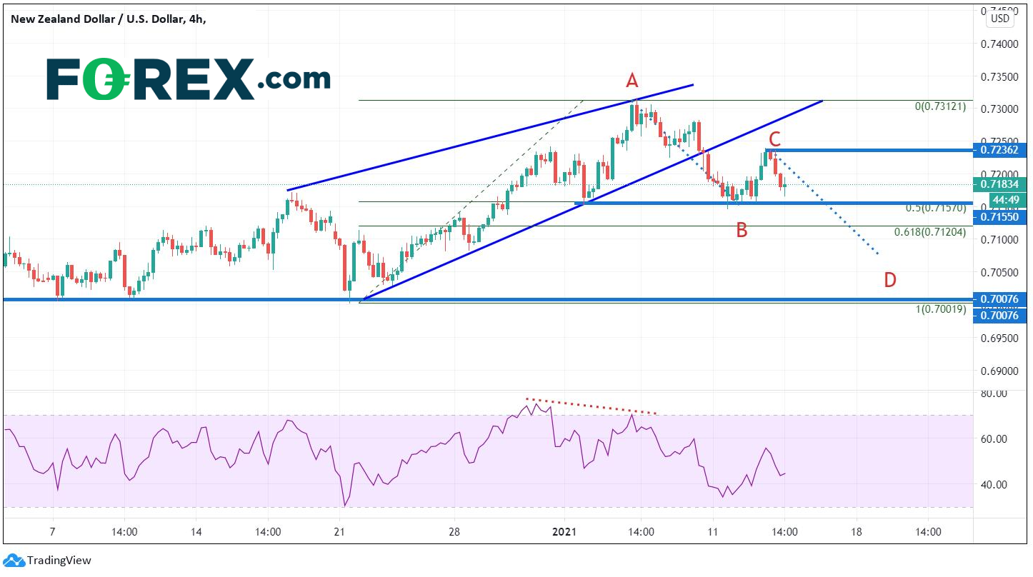纽元/美元走势与欧元/美元类似。汇价于1月6日站上0.7315高点,之后下破上升楔形。货币对于2020年12月12日低点至1月6日高点上行之50%回档0.7150附近暂停跌势。就像欧元/美元一样,纽元/美元似乎正在形成AB=CD形态,目标0.7075。汇价必须首先下破1月11日低点和前述时期走势之61.8%斐波拉契回档水平。若纽元/美元达成AB=CD目标,接下来看向上升楔形目标0.7007附近。若汇价升穿0.7237,形态失效,后市或攻向0.7315附近前高点。