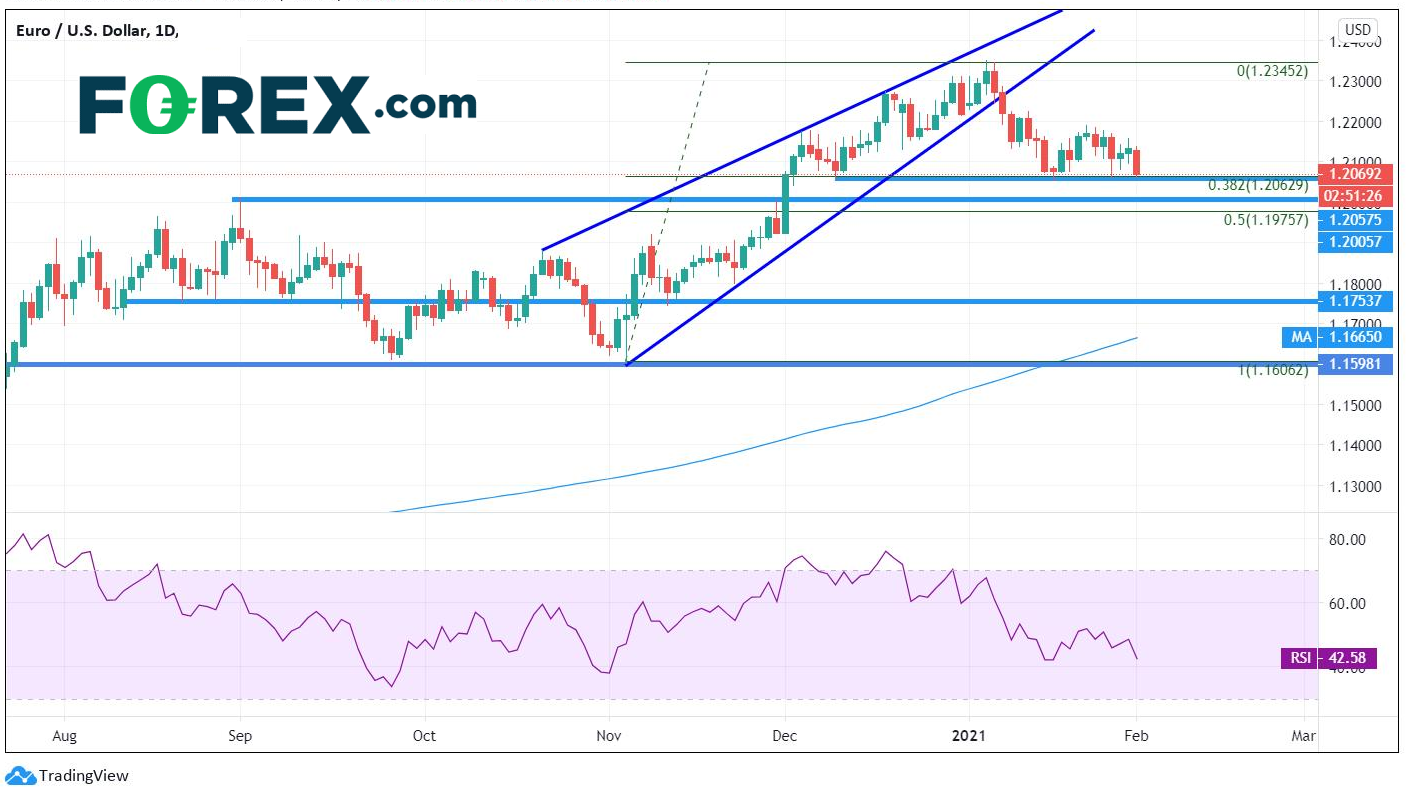 欧元/美元大部分时候走势与美元走势相背。正在美元指数打破下降楔形并尝试走高之际,欧元/美元自一个上升楔形下破并试图下跌。如果收于1.2063/1.2050附近的水平支撑位与38.2%回档位下方,可能打开跌至1.2011的空间,该位是2020年9月1日前高点。但多头正在守护1.2050,一如1月18日的情形。如果下破1.2011,支撑位在前述行情的50%回档位1.1975。