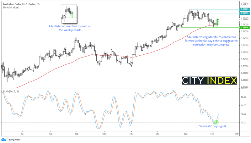 澳元/美元的走势表明,日图上从0.7820高点以来的修正行情或已走完。该货币对处于清晰的上涨趋势中,过去几周的修正也是温柔有加。50天指数移动均线眼下构成支撑,而周二出现的长实体十字星(陀螺顶)形态表明空头不愿发力,之后又形成两根小区间K线。更重要的是,周五构筑看涨吞噬K线并收在高点,即众所周知的长阳线。随机指标也在周五发出买入信号。