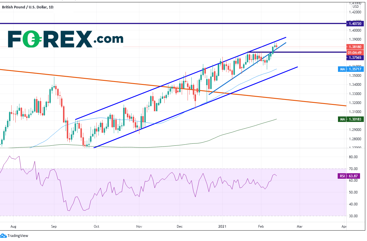 2020年9月中旬以来,英镑/美元一直处于一个上升通道内。英镑/美元在此通道内开始构建上升楔形,且于2月初一度跌破。但在英国央行2月4日决议出炉后,多头卷土重来,马不停蹄地将此货币对自1.3566低点一路推高,先是创下2018年4月以来新高,然后摸至前述通道与楔形的上轨,即1.3866附近。英镑/美元周三和周四形成镊子顶,表明空头守在上方趋势线附近。如果站上周三高点,后市阻力在遥远的心理整数关口1.4000。如果攻克,价格可以涨至2018年以来的水平阻力位1.4072附近。第一支撑位在前高点1.3758附近,然后是2月4日(英国央行会议日)低点1.3566,那也是50天均线所在。上升通道的下轨趋势线在1.3500附近。
